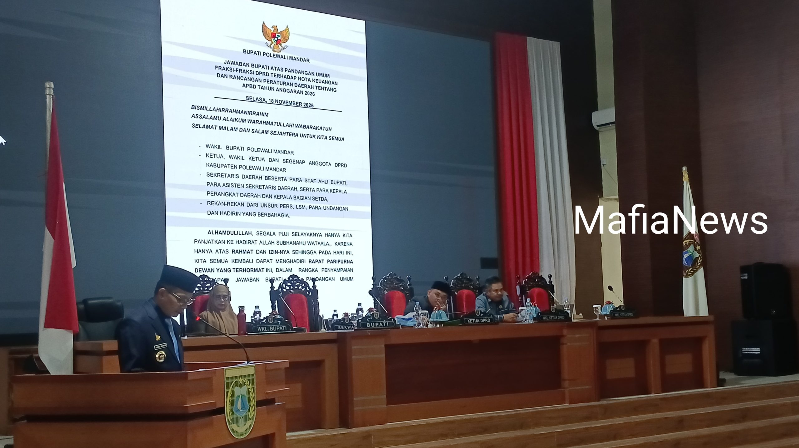 MafiaNews.id /Polman – DPRD Kabupaten Polewali Mandar menggelar rapat paripurna dengan agenda penyampaian tanggapan dan jawaban Bupati atas pandangan umum fraksi-fraksi DPRD terkait Rancangan Peraturan Daerah (Ranperda) tentang APBD dan Nota Keuangan Tahun Anggaran 2026, Selasa malam (18/11/2025).