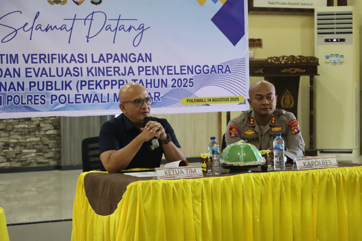 MafiaNews.id / Polman – Kapolres Polewali Mandar menerima kunjungan Tim Penilai Internal (TPI) Mabes Polri dalam rangka Verifikasi Lapangan Penilaian Kinerja Pelayanan Publik (PEKPPP) 2025, Kamis (14/8/2025) di Aula Rupatama Polres Polman.