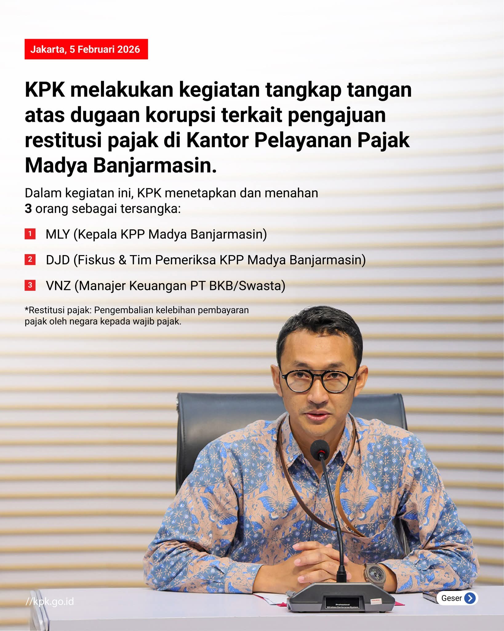 MafiaNews.id | JAKARTA — Komisi Pemberantasan Korupsi (KPK) melakukan operasi tangkap tangan (OTT) terkait dugaan tindak pidana korupsi dalam pengajuan restitusi pajak di Kantor Pelayanan Pajak (KPP) Madya Banjarmasin. Dalam operasi tersebut, KPK menetapkan dan menahan tiga orang sebagai tersangka, salah satunya MLY yang menjabat sebagai Kepala KPP Madya Banjarmasin. (Jakarta, 5 Februari 2026).