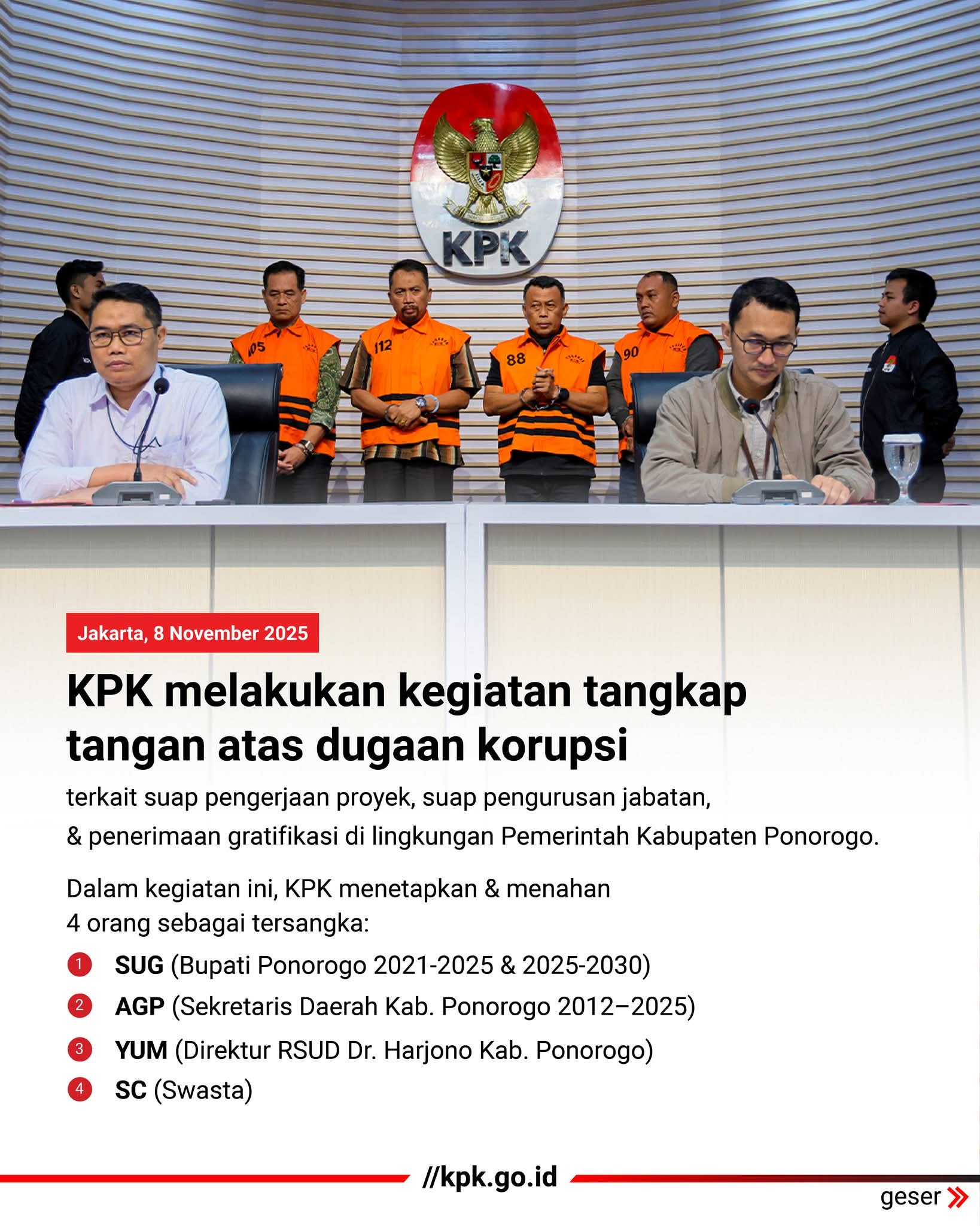 Wakil Ketua KPK, [nama pejabat KPK, bisa ditambahkan bila ada], dalam konferensi pers di Gedung Merah Putih KPK, Jakarta, menyampaikan bahwa penetapan tersangka ini merupakan hasil kegiatan tangkap tangan (OTT) yang dilakukan tim KPK beberapa waktu lalu di wilayah Ponorogo dan sekitarnya. Sabtu 8 November 2025.