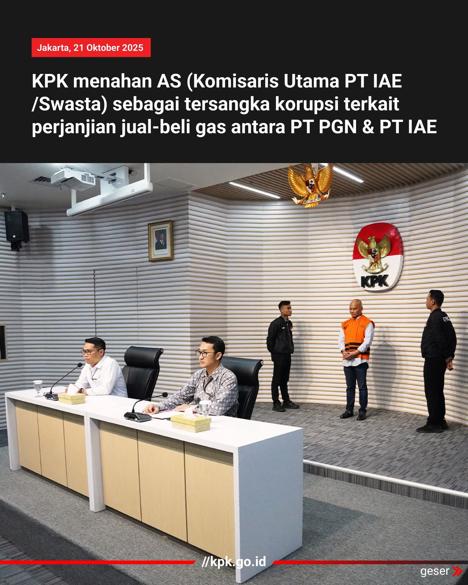 MafiaNews.id|Jakarta- Komisi Pemberantasan Korupsi (KPK) resmi menahan AS, selaku Komisaris Utama PT IAE (swasta), atas dugaan tindak pidana korupsi dalam perjanjian jual-beli gas antara PT Perusahaan Gas Negara (PGN) dan PT IAE.