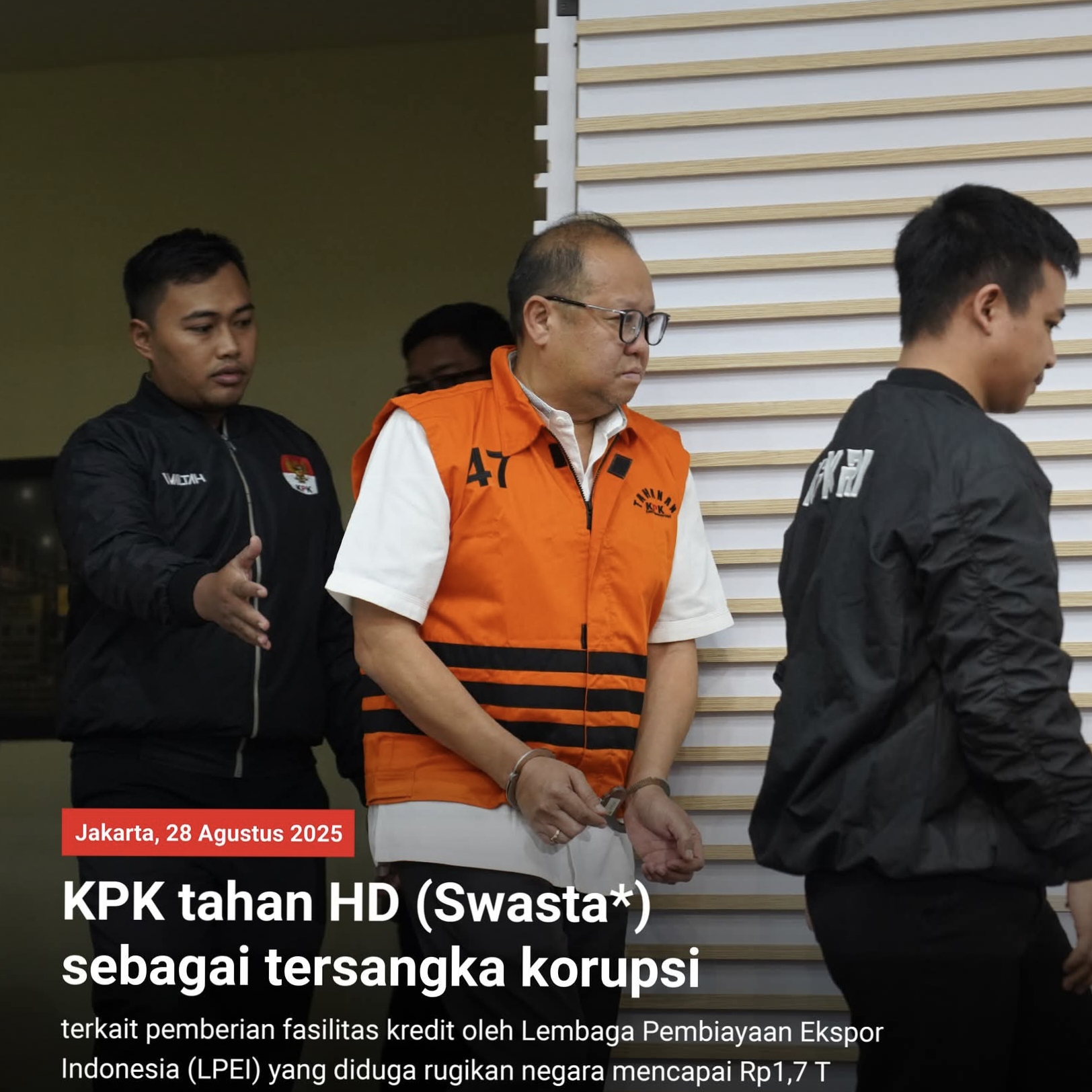 MafiaNews.id / Jakarta – Komisi Pemberantasan Korupsi (KPK) resmi menahan seorang pengusaha berinisial HD (swasta) sebagai tersangka kasus dugaan korupsi terkait pemberian fasilitas kredit oleh Lembaga Pembiayaan Ekspor Indonesia (LPEI). Kasus ini diduga menimbulkan kerugian negara mencapai Rp1,7 triliun. Kamis 28 Agustus 2025.