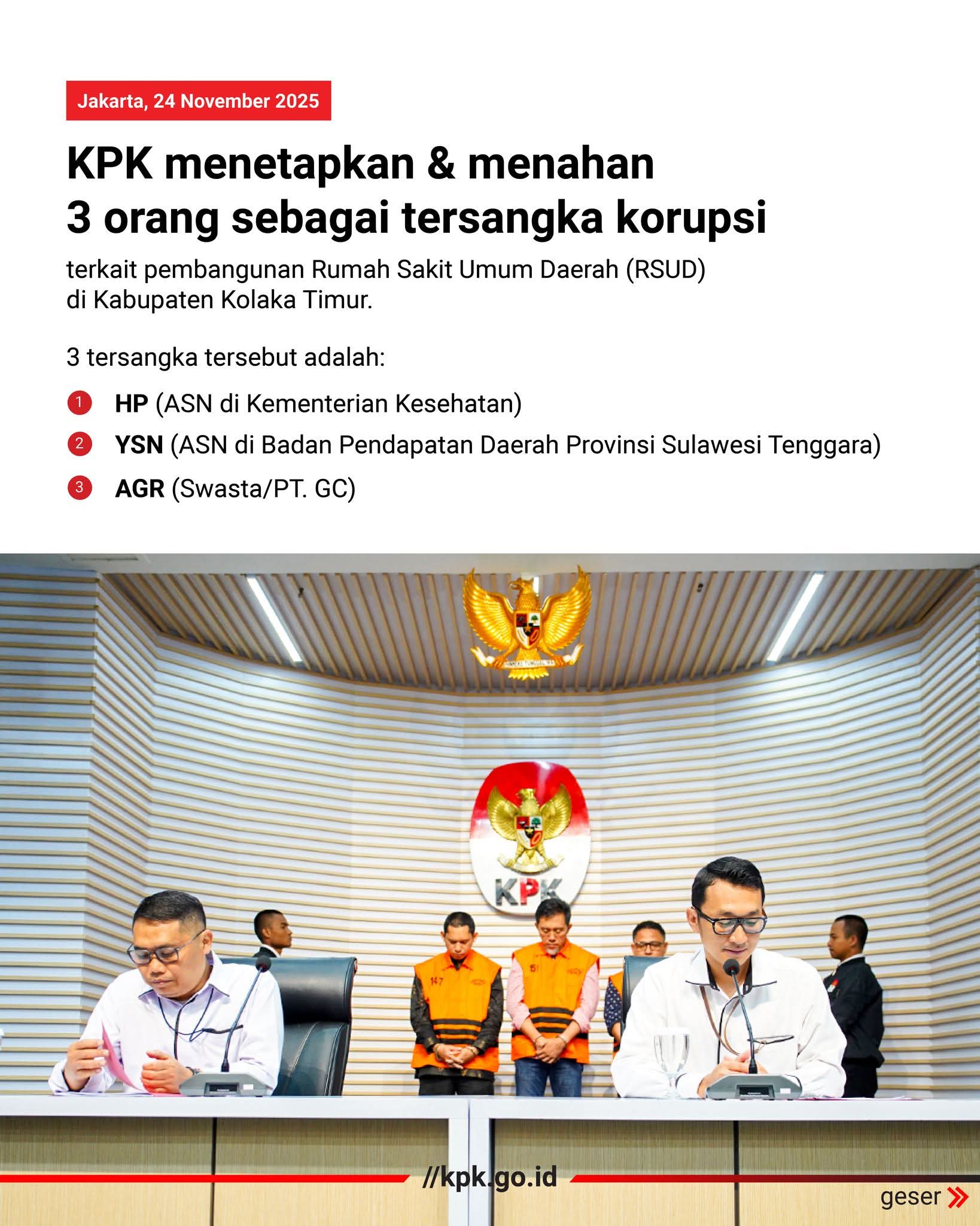 MafiaNews.id/ Jakarta / Komisi Pemberantasan Korupsi (KPK) resmi menetapkan dan menahan tiga orang sebagai tersangka kasus dugaan korupsi dalam pembangunan Rumah Sakit Umum Daerah (RSUD) di Kabupaten Kolaka Timur.